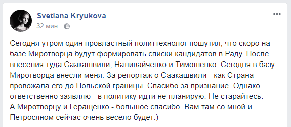 "Сегодня утром один провластный политтехнолог пошутил, что скоро на базе Миротворца будут формировать списки кандидатов в Раду. После внесения туда Саакашвили, Наливайченко и Тимошенко. Сегодня в базу Миротворца внесли меня. За репортаж о Саакашвили - как Страна провожала его до Польской границы. Спасибо за признание. Однако ответственно заявляю - в политику идти не планирую. Не старайтесь. А Миротворцу и Геращенко - большое спасибо. Вам там со мной и Петросяном сейчас очень весело будет:)", - написала заместитель главного редактора "Страны" в Facebook.