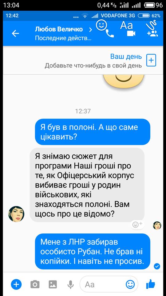 Он также приводит интернет-переписку одного из военнопленных, которому он помог выйти из плена и Любовь Величко, которая говорит, что снимает сюжет для программы "Наши деньги"