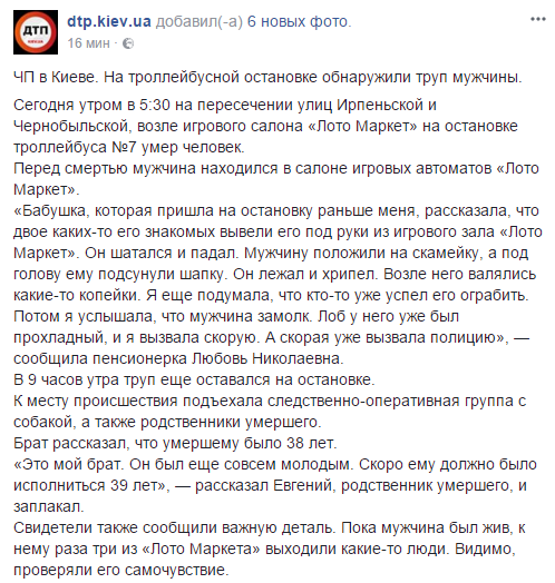 "Перед смертью мужчина находился в салоне игровых автоматов "Лото Маркет". "Бабушка, которая пришла на остановку раньше меня, рассказала, что двое каких-то его знакомых вывели его под руки из игрового зала "Лото Маркет". Он шатался и падал. Мужчину положили на скамейку, а под голову ему подсунули шапку. Он лежал и хрипел. Возле него валялись какие-то копейки. Я еще подумала, что кто-то уже успел его ограбить. Потом я услышала, что мужчина замолк. Лоб у него уже был прохладный, и я вызвала скорую. А скорая уже вызвала полицию", — сообщила пенсионерка Любовь Николаевна. В 9 часов утра труп еще оставался на остановке. К месту происшествия подъехала следственно-оперативная группа с собакой, а также родственники умершего", - говорится в сообщении.