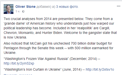 Американский режиссер Оливер Стоун, который украинцам известен фильмами про Владимира Путина и "Украина в огне", раскритиковал политику США в Украине, назвав нашу страну "гангстерским государством". Об этом он написал в Facebook.
