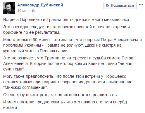 "Много меньше 60 минут - это значит, что вопросы Петра Алексеевича и проблемы Украины - Трампа не волнуют. Даже не смотря на купленный уголь в Пенсильвании. Это же означает, что Трампа не интересует и судьба самого Петра Алексеевича. Который после его борьбы за Клинтон - явно "не наш сукин сын". Могу также предположить, что после этой встречи у Порошенко остался только один вариант сохранения должности - выполнение "Минских соглашений". Очень хочу посмотреть, как он их попытается реализовать. И могу опять же предположить - что это начало его пути вперёд ногами", -заявил Дубинский.