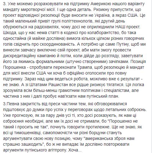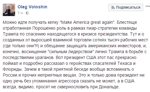"Блестяще отработанная Порошенко роль в рамках пиар-стратегии команды Трампа по спасению находящегося в кризисе президентства. Тут и о созданных от выросшей взаимной торговли сотнях тысяч рабочих мест (где только они?!) и обещание защищать американских инвесторов, и, конечно, восхищение "сильным лидерством" лично Трампа в борьбе с последствиями ураганов. Вот президент США этот пас прекрасно поймал и подробно рассказал о геройствах спасателей Техаса и Флориды. Зачем в такой приятной беседе вообще вспоминать о России и прочих неприятных вещах. Это ж только дома президент ни одну речь без упоминания агрессора сказать не может, а в США всегда, видимо, просят не сквернословить при Дональде", - написал он.
