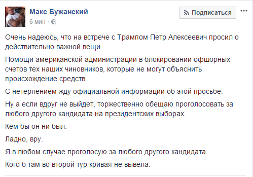 Журналист Макс Бужанский иронично заявил, что надеется, что на встрече с Трампом Петр Алексеевич просил о действительно важной вещи.