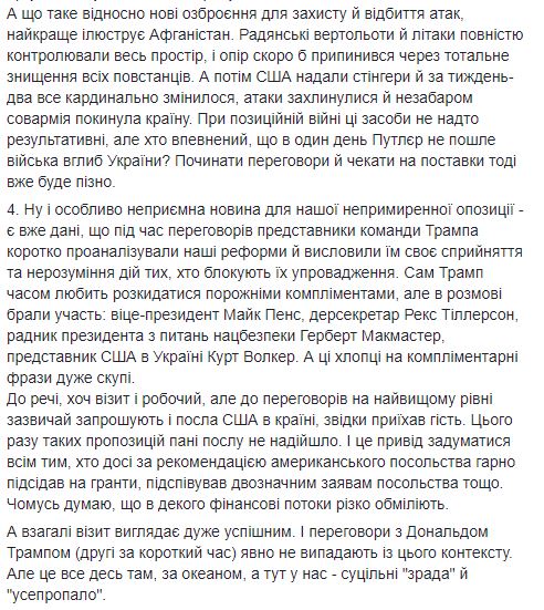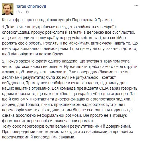 Успешной встречу считает и бывший нардеп от Партии регионов Тарас Черновол (сын известного диссидента). По его мнению, информацию о неуспешности визита распространяют как "коллаборанты Кремля", так и украинские получатели американских грантов.
