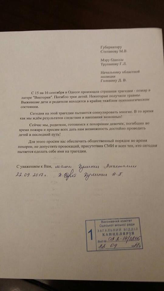 "Сегодня мы, родители, готовимся к похоронам девочек, погибших во время пожара, и просим всех дать нам возможность достойно проводить детей в последний путь! Для этого просим вас обеспечить общественный порядок во время похорон, не допустить провокаций, присутствия СМИ и всех тех, кто сегодня пытается сделать себе имя на трагедии", - говорится в обращении на имя Одесского городского головы Геннадия Труханова, главы Одесской государственной администрации Максима Степанова и начальника Главного управления Нацполиции в Одесской области Дмитрия Головина.