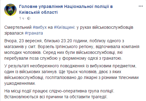 В поселке Ворзель Киевской области в руках военнослужащих взорвалась граната. Один военный погиб, еще трое мужчин госпитализированы, передает пресс-служба Нацполиции в Киевской области в Facebook.