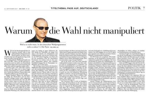 "Почему Путин не манипулирует выборами? Потому что он в этом не нуждается," - пишет газета Die Zeit. По ее данным, только две партии из семи (Зеленые и Христианские демократы) выступают за продолжение прежней политики в отношении России. Остальные готовы так или иначе отменить поэтапно санкции без того, чтобы Россия полностью выполнила условия Минских соглашений.