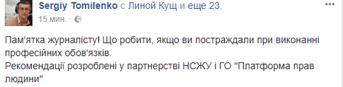 "Памятка журналисту! Что делать, если вы пострадали при исполнении профессиональных обязанностей. Рекомендации разработаны в партнерстве НСЖУ и ОО "Платформа прав человека", - пояснил Сергей Томиленко.