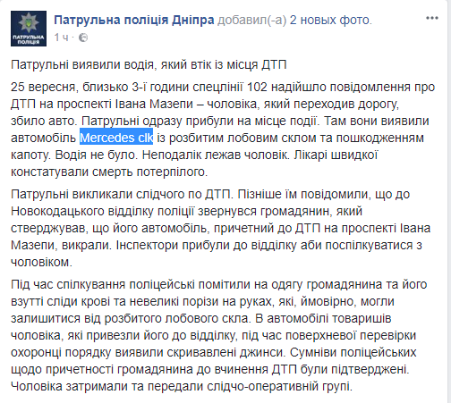 Там сегодня около 3 часов ночи Mercedes clk сбил мужчину, который переходил дорогу. На месте ДТП патрульные обнаружили автомобиль с разбитым лобовым стеклом и повреждением капота.