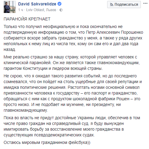 "Только что получил неофициальную и пока окончательно не подтвержденную информацию о том, что Петр Алексеевич Порошенко собирается вскоре забрать гражданство у меня, а также у ряда других нелояльных к нему лиц из числа тех, кому он сам его и дал два года назад. Мне реально страшно за нашу страну, которой управляет человек с клинической паранойей. Он же является также главнокомандующим, гарантом Конституции и лидером воющей страны", - написал Сакварелидзе.