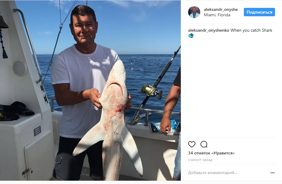 Беглый народный депутат Александр Онищенко, с которого в Украине сняли депутатскую неприкосновенность, похвастался в соцсети, что словил акулу в Майами. Фото с добычей нардеп опубликовал в Instagram.