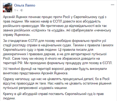 "Мы намерены в ЕСПЧ доказать всю абсурдность российского кривосудия. Мы привлечем к ответственности всех так называемых российских "следователей" и "судей", которые сфабриковали "чеченское дело Яценюка", - подчеркнула она.