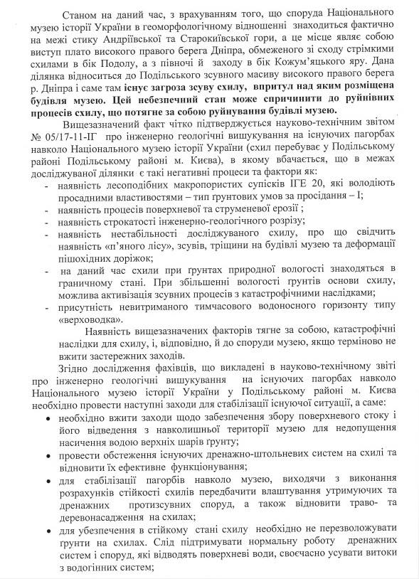 Администрация Национального музея истории Украины отмечает, что угрозу смещения склона подтверждает научно-технический отчет.