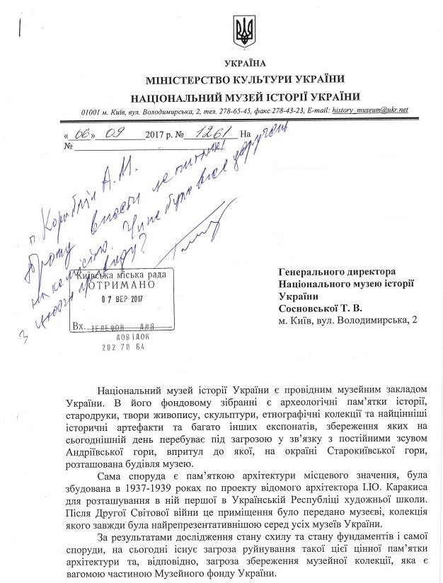 В обращении администрация музея отмечает, что здание-памятник архитектуры был построено на стыке Андреевской и Старокиевской гор в 1937-1939 годах, а этот участок является оползнеопасным.