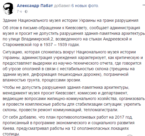 В то же время по словам Александра Пабата, план противооползневых работ на 2017 год, прописанный в программе экономического и социального развития Киева, предусматривал работы на 12 оползнеопасных локациях столицы, но адреса Национального музея истории Украины в плане на этот год нет.