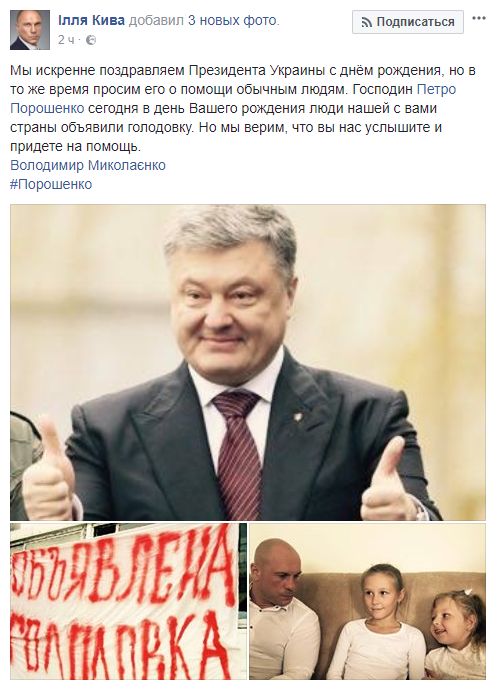 Илья Кива, глава СПУ: "Мы искренне поздравляем Президента Украины с днём рождения, но в то же время просим его о помощи обычным людям. Господин Петро Порошенко сегодня в день Вашего рождения люди нашей с вами страны объявили голодовку. Но мы верим, что вы нас услышите и придете на помощь".