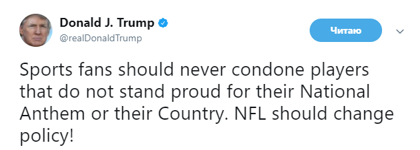 "Если фанаты НФЛ откажутся ходить на игры, пока игроки не перестанут проявлять неуважение к нашему флагу и стране, вы увидите быстрые изменения. Увольнять или отстранять", – призвал Трамп.