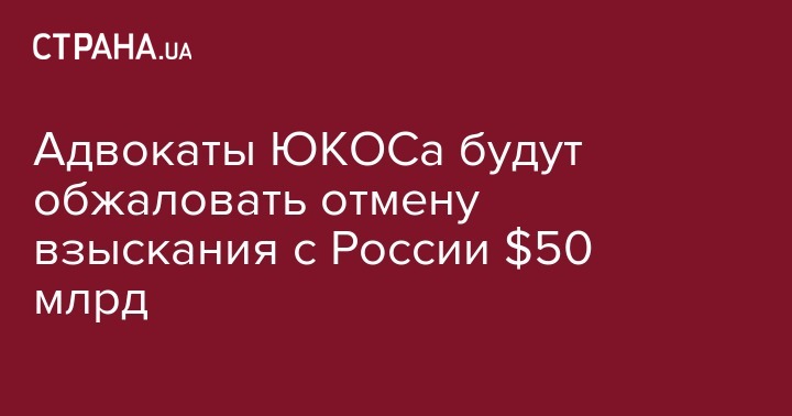 Как сообщала "Страна", Россия добилась отмены в суде взыскания $50 млрд.в пользу акционеров ЮКОСа. Окружной суд Гааги отменил решение о выплате Россией в пользу экс-акционеров "ЮКОСа" компенсации в размере $50 млрд. Апелляционный суд установил, что в компетенцию арбитража не входило рассмотрение исков подобного рода.