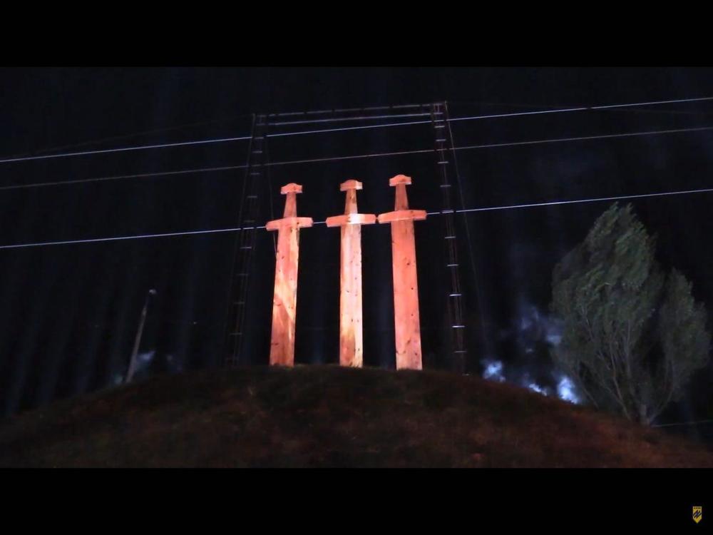 Рядом на пригорке разместили фигуры три муляжа огромных мечей, воткнутых в землю.