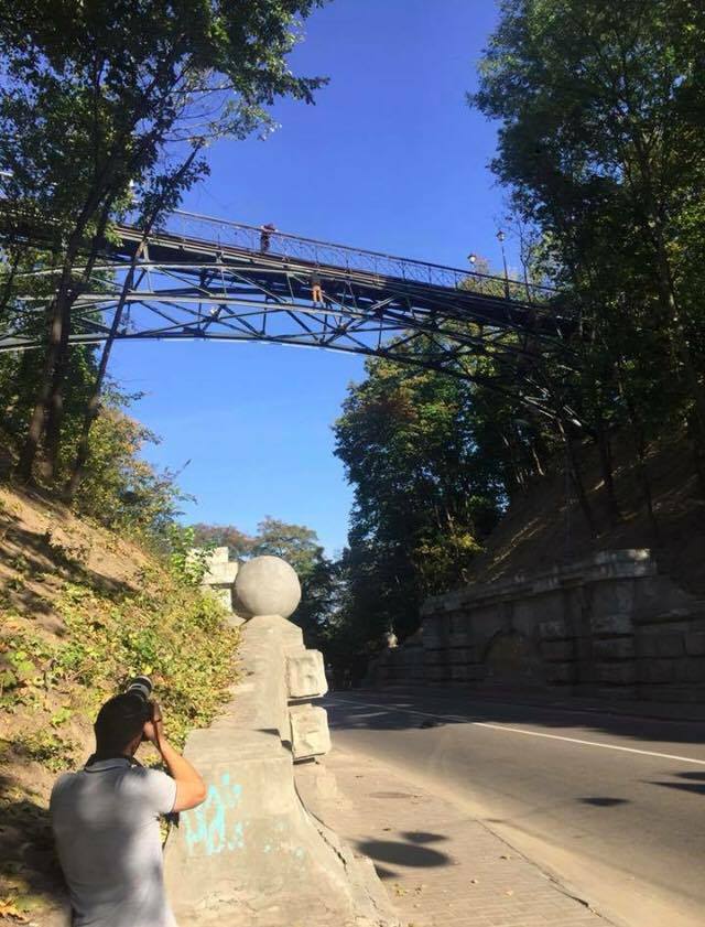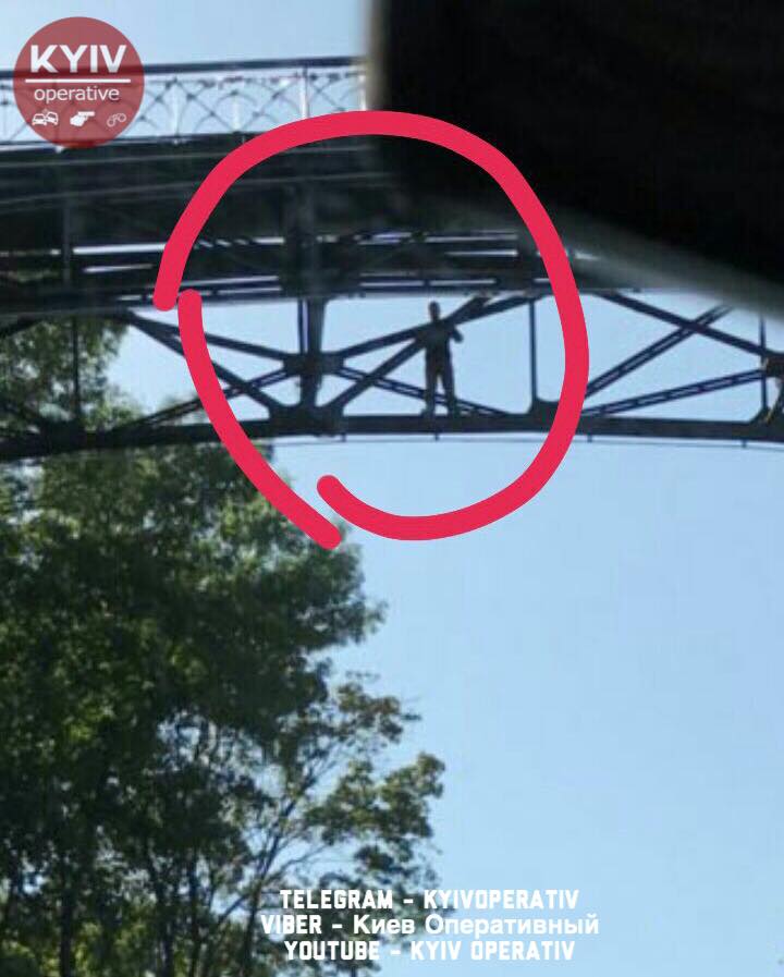 "Кто собирается ехать с днепровской набережной в центр - не едьте. На мосту влюбленных парень собирается прыгать. Все перекрыли. Ждут МЧС. Машины разворачивают. АПДТ: орет про п*даров и прокуратуру. Пьяный. Сигаретку принесли ему", - написала она в Facebook.