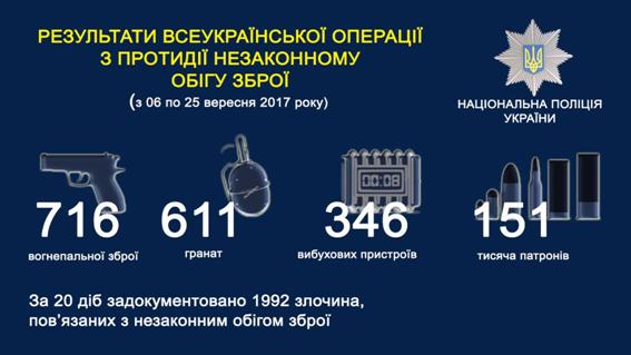 В рамках кампании против незаконного оружия на пресекался поток оружия из зоны АТО. На блокпостах и стационарных постах сотрудники полиции проверили почти 211 тыс. транспортных средств, изъяли 441 единицы боеприпасов, 6 взрывных устройств, 6 единиц огнестрельного оружия и 1 кг взрывчатых веществ.