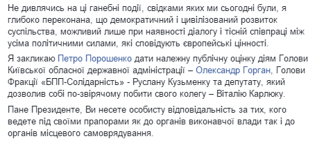 "Сейчас я вижу угрозу моей жизни, жизни депутатов коалиции в областном совете", - добавила депутат. Она призвала Порошенко "дать надлежащую публичную оценку действиям председателя Киевской областной государственной администрации - Александра Горгана, председателя Фракции "БПП-Солидарность" - Руслана Кузьменко и депутата, который позволил себе зверски избить своего коллегу - Виталия Карлюка".