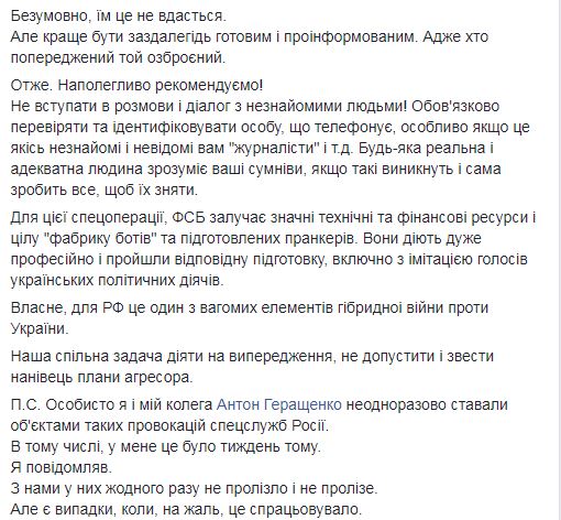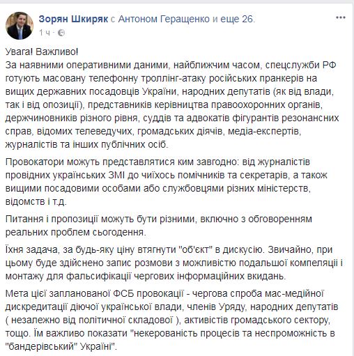 "По имеющимся оперативным данным, в ближайшее время спецслужбы РФ готовят массированную телефонную троллинг-атаку российских пранкеров на высших государственных должностных лиц Украины, народных депутатов (как от власти, так и от оппозиции), представителей руководства правоохранительных органов, госчиновников различного уровня, судей и адвокатов фигурантов резонансных дел, известных телеведущих, общественных деятелей, медиа-экспертов, журналистов и других публичных лиц", - написал Шкиряк.