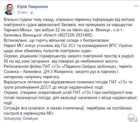 "Около часа назад, получена первичная информация от экипажа воздушного судна авиакомпании "Белавиа", которое следовало по маршруту Ларнака-Минск, о взрывах в 22 км к северу от г. Винница - п.г.т. Калиновка Винницкой области. Установлено, что горят военные склады с боеприпасами. Сейчас МИУ ожидает уточнений от ГШ ВСУ и командование ВВС Украины по зоне ограничений полетов воздушных судов. Отдельно решением Украэроцентра закрыто воздушное пространство в радиусе 50 км от зоны возгорания от поверхности до неограниченной высоты", - написал он на своей странице в сети Facebook.