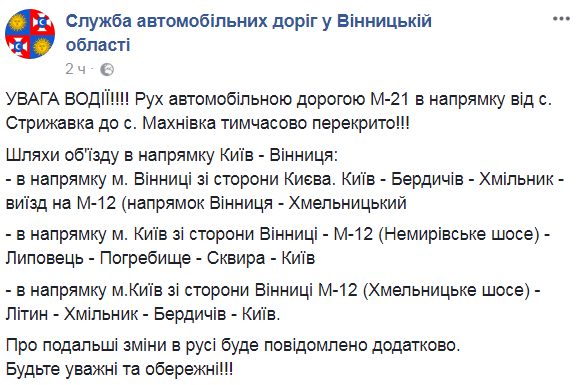 "В направлении Киев – Винница: в направлении Винницы со стороны Киева. Киев - Бердичев - Хмельник - выезд на М-12 (направление Винница – Хмельницкий). В направлении. Киев со стороны Винницы - М-12 (Немировская шоссе) - Липовец - Погребище - Сквира – Киев; в направлении Киев со стороны Винницы М-12 (Хмельницкое шоссе) - Литин - Хмельник - Бердичев – Киев", сообщается на странице службы в Фейсбук.