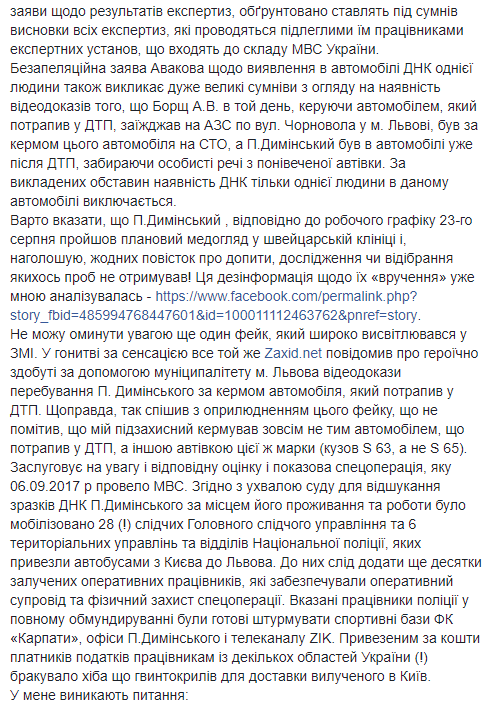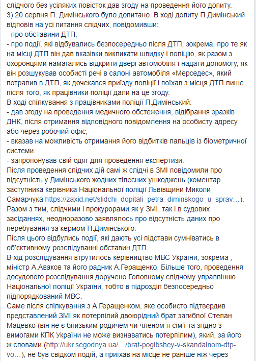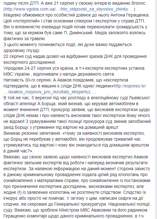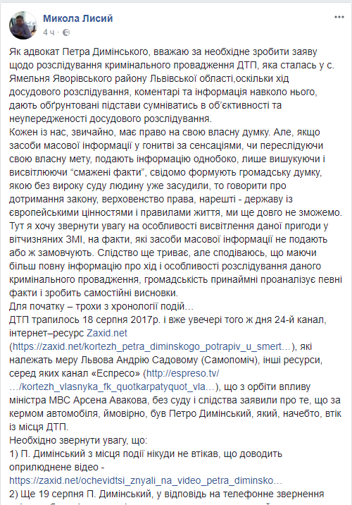 По убеждению Лысого, в расследование "вмешалось руководство МВД Украины, в частности, министр Арсен Аваков и его советник Антон Геращенко". Давление адвокат видит в заявлениях о ДТП министра и его советника, а также в том, что уголовное производство по приказу главы МВД забрали у львовских следователей, и передали в Главное следственное управление Нацполиции в Киеве.