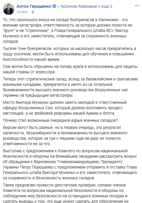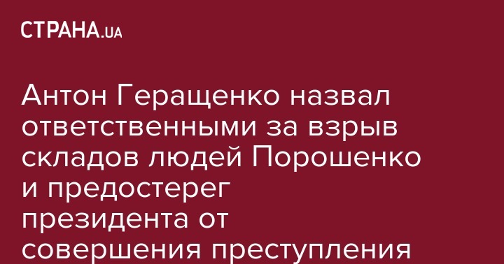 Советник министра внутренних дел Авакова Антон Геращенко, вопреки обыкновению, решил обвинить во взрывах на военных складах не руку Кремля, а людей президента Петра Порошенко. В частности, по его мнению,ответственным за пожар на складе боеприпасов в Калиновке является лично глава Генерального штаба ВСУ Виктор Муженко и его заместитель, который отвечает за сохранность военных складов. Также он предупреждает Порошенко, что если он не примет соответствующие меры, то это будет преступлением против безопасности.