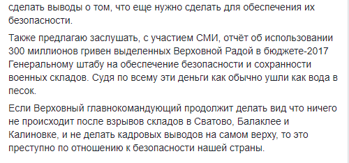 "Также предлагаю заслушать, с участием СМИ, отчет об использовании 300 миллионов гривен выделенных Верховной Радой в бюджете-2017 Генеральному штабу на обеспечение безопасности и сохранности военных складов. Судя по всему эти деньги как обычно ушли как вода в песок", - считает Геращенко.