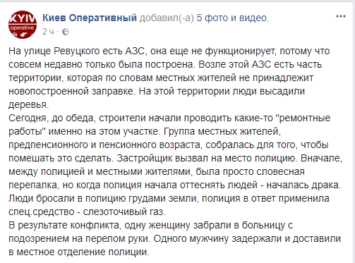 В Киеве на улице Ревуцкого, где жители уже давно протестуют против строительства АЗС, произошел конфликт и драка на территории этой еще не функционирующей заправки. Об этом сообщает "Киев Оперативный" в Facebook.