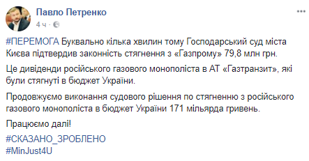 "Буквально несколько минут назад Хозяйственный суд города Киева подтвердил законность взыскания с "Газпрома" 79,8 миллионов гривен. Это дивиденды российского газового монополиста в АО "Газтранзит", которые были взысканы в бюджет Украины", - заявил Петренко.