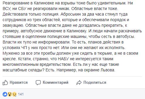 Он также отмечает, что реагирование в Калиновке на взрывы тоже было удивительным. "Ни ВСУ, ни СБУ не реагировали никак. Областные власти тоже. Действовала только полиция. Аброськин за два часа стянул туда сотрудников из трех областей, которые и обеспечивали порядок и эвакуацию. Областные власти даже не догадались прекратить, к примеру, автобусное движение в Калиновку. И люди начали раскачивать стоявшие в оцеплении полицейские машины, чтобы сесть в автобусы. Власти их тупо не информировали. То есть, планов действия в условиях ЧП у них просто нет. Или они не желают их исполнять. Муженко за все эти п....ы должен уже сидеть в тюрьме, а не в своем кресле. Кстати, странно, что НАБУ не интересуется таким многомиллионным вредительством. Есть ли у нас еще такие масштабные склады? Есть. Например, на окраине Львова", - отмечает Станислав Речинский.