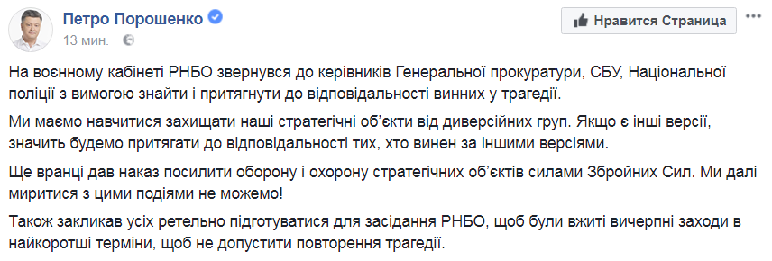 "Мы должны научиться защищать наши стратегические объекты от диверсионных групп. Есть другие версии? Значит будем привлекать к ответственности тех, кто будет по другим версиям", - заявил Поршенко обращаясь к руководителям Генпрокуратуры, СБУ и Нацполиции.