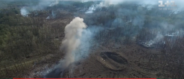 ТСН опубликовал кадры трассы между Калиновкой, Павловкой и Сальником. Как можно увидеть лес дымит, но огня не видно. На фото видны воронки от взрывов и сгоревшие в огне деревья.