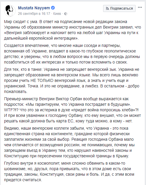 На весь скепсис отвечает нардеп Мустафа Найем. Он говорит, что Украина должна в первую очередь думать о своих интересах, а не соседей, поэтому нацменьшинства просто "вежливо просят учить не только венгерский, но и украинский".