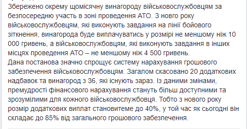 Сохранено отдельное ежемесячное вознаграждение за непосредственное участие в зоне проведения АТО, с нового года это будет не менее 10 тыс. гривен для военных на передовой, и 4,5 тыс. гривен для военных в других местах проведения АТО.