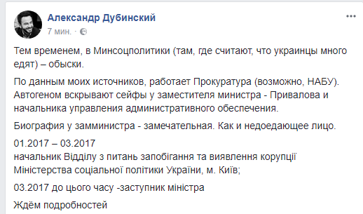 "Автогеном вскрывают сейфы у заместителя министра - Привалова (Александра, - Прим.ред.) и начальника управления административного обеспечения. Биография у замминистра - замечательная. Как и недоедающее лицо", - пишет Дубинский.