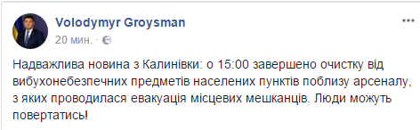 "Сверхважная новость из Калиновки. В 15.00 завершена зачистка от взрывоопасных предметов населенных пунктов вблизи арсенала, из которых проводилась эвакуация местных жителей. Люди могут возвращаться!" - написал премьер на странице в Facebook.