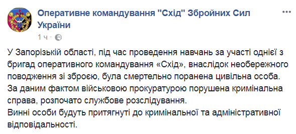 Во время проведения учений с участием одной из бригад оперативного командования "Восток" было смертельно ранен мирный житель. Трагедия произошла в Запорожской области "вследствие неосторожного обращения с оружием".