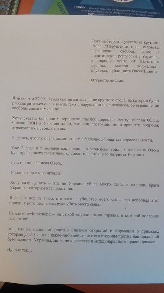Кроме того, евродепутатам зачитали открытое письмо матери погибшего. В нем она утверждает, что "это не Украина убила моего сына, а нелюди, враги Украины, которым нет прощения". Она также выразила благодарность Европарламенту и миссии ОБСЕ за то, что они уделяют внимание проблемам прав человека в Украине.