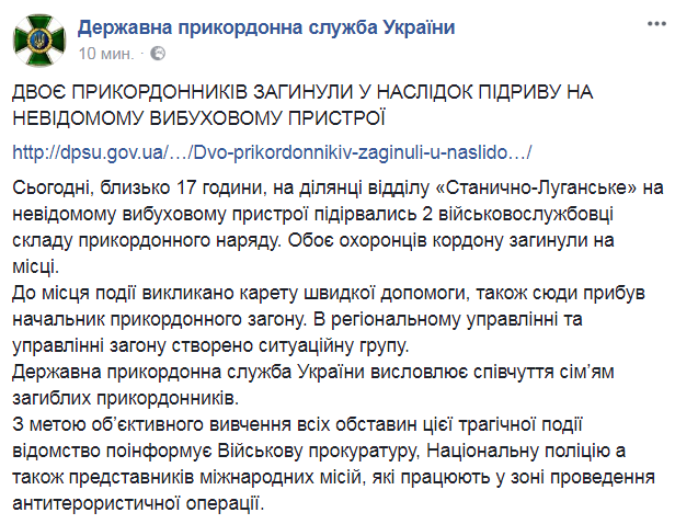Около 17 часов четверга, 28 сентября на участке отдела "Станично-Луганское" на неизвестном взрывном устройстве подорвались два военнослужащих пограничного наряда. Оба пограничника погибли на месте.