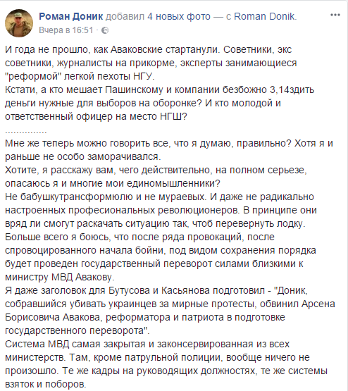 "В сегодняшней ситуации надо бояться не обывателей и не профессиональных спикеров, - пишет Доник. - И даже не радикально настроенных профессиональных революционеров. В принципе, они не смогут развернуть ситуацию так, чтобы перевернуть лодку. Больше всего я боюсь, что после ряда провокаций, после спровоцированного начала бойни, под видом сохранения порядка будет проведен государственный переворот силами лиц, близких к министру МВД Авакова".