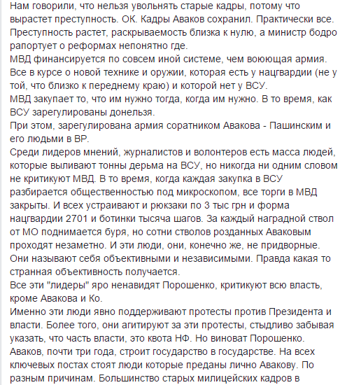 "Среди лидеров мнений, журналистов и волонтеров есть масса людей, которые выливают тонны дерьма на ВСУ, но никогда ни одним словом не критикуют МВД. В то время, когда каждая закупка в ВСУ разбирается общественностью под микроскопом, все торги в МВД закрыты. И всех устраивают и рюкзаки по 3 тыс грн и форма нацгвардии 2701 и ботинки тысяча шагов. За каждый наградной ствол от МО поднимается буря, но сотни стволов розданных Аваковым проходят незаметно. И эти люди, они, конечно же, не придворные. Они называют себя объективными и независимыми. Правда какая то странная объективность получается.