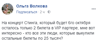 "На концерт Стинга, который будет 6-го октября осталось только 2 билета в VIP партере, мне вот интересно - кто все эти люди, которые выкупили остальные билеты по 25 тысяч?", -написала Ольга Волкова.