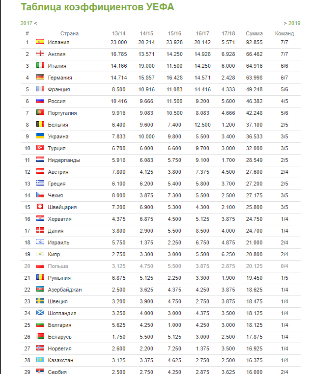Продолжают увеличивать свой рейтинг австрийские команды, и уже реально угрожают 11-му месту Нидерландов, которое может оказаться проходным для чемпиона страны в группу Лиги чемпионов. Шотландия и Болгария обошли Белоруссию и движутся в фарватере Азербайджана и Швеции.