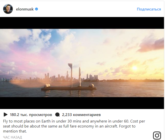 В своем Instagram Маск добавил, что стоимость поездки будет на уровне стоимости эконом-класса самолета.
