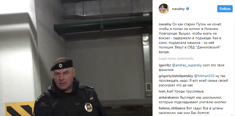 "Ох как старик Путин не хочет, чтобы я попал на митинг в Нижнем Новгороде. Вышел, чтобы ехать на вокзал - задержали в подъезде. Как в кино, подъехала машина - из неё полиция. Везут в ОВД "Даниловский" вроде", - написал Навальный.